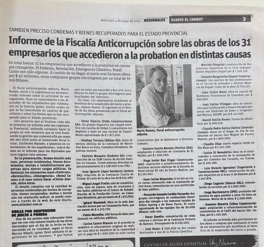 En abril de 2022, el fiscal anticorrupción adjunto, Mario Romeo, presentó en Legislatura un completo informe sobre la actividad de ese organismo, donde detalló casos, personas condenadas, bienes decomisados, multas e inhabilitaciones perpetuas para ejercer cargos públicos. Entre las causas más resonantes, estaban los casos “Embrujo”, “Revelación”, “Emergencia Climática” y “Royal Canin”, entre otras. También hubo un listado de 31 empresarios que accedieron al “beneficio de la suspensión del juicio a prueba” a cambio de realizar obras para la comunidad.
