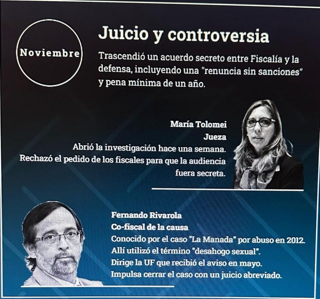 El tema ya genera indignación en los principales despachos de la Justicia, y podría derivar en una denuncia para determinar responsabilidades, ante las siguientes preguntas: ¿por qué no se avisó con anticipación al empleador para que pudiera apartar de su cargo al médico o al menos no asignarle pericias con menores?; ¿por qué recién se conoció el dato en octubre, cuando ya estaba listo un acuerdo de partes entre el fiscal Rivarola y Fabián Gabalachis, abogado defensor del médico, para llegar a un juicio abreviado en secreto, con una condena mínima de un año?