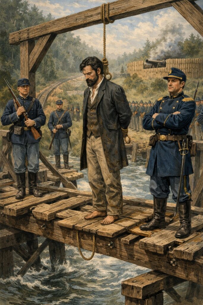 -Los yanquis están reparando las vías del ferrocarril -dijo el hombre- porque se preparan para avanzar. Han llegado hasta el Puente del Búho, lo han reparado y han construido una empalizada en la orilla norte. Por una orden, colocada en carteles por todas partes, el comandante ha dictaminado que cualquier civil a quien se le sorprenda en intento de sabotaje a las líneas férreas será ejecutado sin juicio previo. Yo he visto la orden.