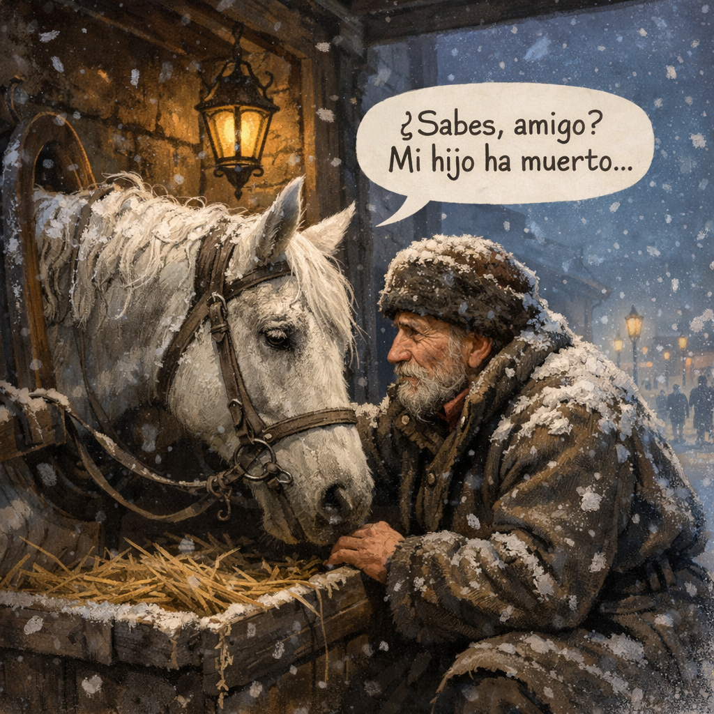 Torna a quedarse solo con su caballo. La tristeza invade de nuevo, más dura, más cruel, su fatigado corazón. Observa a la multitud que pasa por la calle, como buscando entre los miles de transeúntes alguien que quiera escucharle. Pero la gente parece tener prisa y pasa sin fijarse en él.