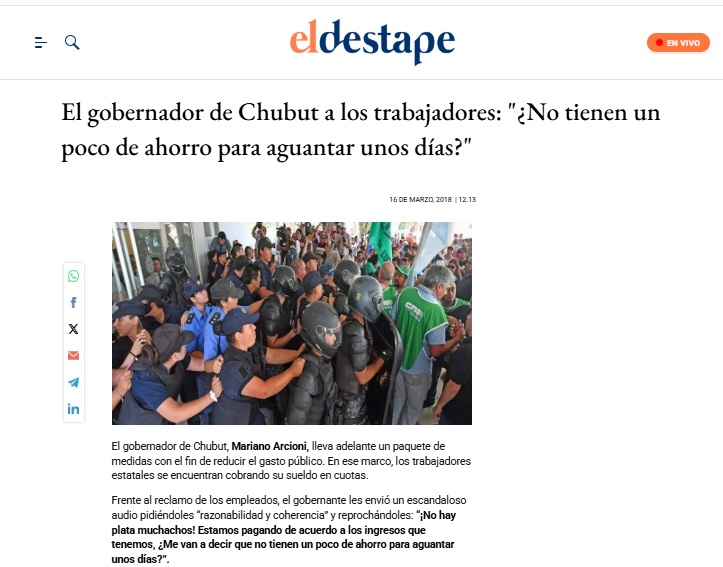 En medio de las protestas de los empleados estatales, Arcioni envió un audio que generó fuerte polémica. Allí pidió “razonabilidad y coherencia” y explicó: “¡No hay plata, muchachos! Estamos pagando de acuerdo a los ingresos que tenemos”. Luego agregó, en tono indignado: “¿Me van a decir que no tienen un poco de ahorro para aguantar unos días?”.