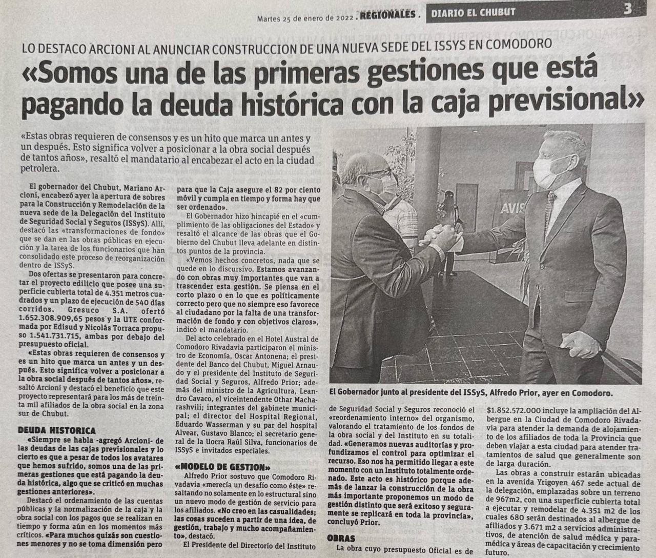 El 24 de enero de 2022, el gobernador Mariano Arcioni abrió los sobres de la licitación para la construcción y remodelación de la nueva sede del Instituto de Seguridad Social y Seguros en Comodoro Rivadavia. Rodeado de funcionarios, dirigentes y empresarios, el mandatario afirmó que la obra marcaría “un antes y un después” y volvería a “posicionar a la obra social después de tantos años”.