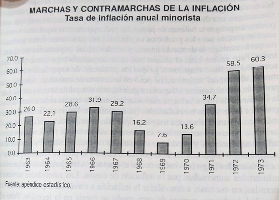 Al finalizar los años 60, la Argentina ya se perfilaba como candidata seria al récord mundial de inflación sostenida en el siglo XX. Una publicación de las Naciones Unidas la ubicaba entre los ocho países con más alta inflación en todo el mundo. A comienzos de los 70 llegó un consuelo de tontos: el aumento persistente de los precios pasó a ser un mal de muchos, al desmoronarse en el mundo desarrollado la estabilidad diseñada en Bretton Woods. Lo que allí era casi una novedad, en la Argentina ya tenía una historia bastante larga, que se remontaba al final de la Segunda Guerra Mundial. En 1963-73 no apareció la inflación; sólo siguió creciendo, como venía siendo habitual desde hacía un par de décadas.