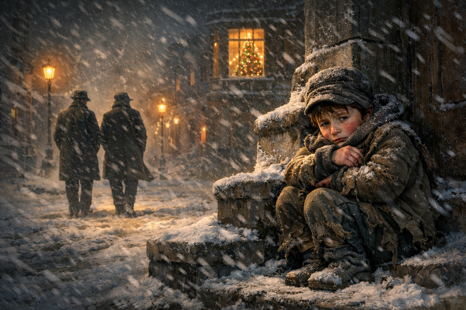 Y los dos amigos se alejaron, reanudando la conversación interrumpida. Sus voces fueron apagándose en la distancia. El muchacho se quedó solo, acurrucadito en el rincón, y la nieve siguió cubriéndolo…
