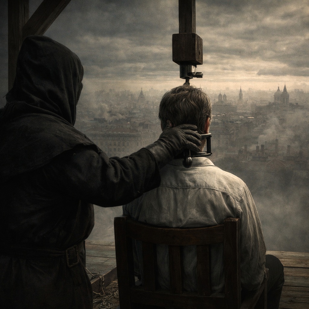 Llegamos, por último, a la vista del patíbulo situado en medio de un extenso campo. Allí fue mucho mayor mi sorpresa. Ni en torno del patíbulo, ni en toda la tierra que alcanzaban los ojos, se veía tampoco una figura humana. Subí las escaleras del tablado, deteniéndome a cada instante para mirar alrededor, pues no acertaba a comprender lo que era aquello. El cielo presentaba un aspecto distinto. Su manto de nubes era más espeso; la vaporosa túnica de encaje había sido reemplazada por una cortina gris que cerraba herméticamente toda la bóveda celeste; el sol ya no tenía celosía por donde mirarnos. La llanura triste y oscura en que reposa Madrid, exhalaba un vapor transparente que concluía por aproximar la línea vaga y fina que cierra el horizonte. Los objetos ofrecíanse indecisos y temblorosos, como si hubieran perdido sus contornos, y la luz se filtraba con trabajo por aquel cielo de algodón para sumirse luego en la tierra negra y húmeda. Respirábase en este ambiente espeso, que no hería apenas ruido alguno, cierta calma: pero una calma que oprimía en vez de refrescar el corazón.