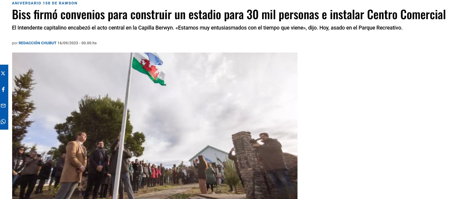 Durante los festejos por el 158 aniversario de Rawson, el 15 de septiembre de 2023, el intendente Damián Biss pronunció un discurso repasando los logros de su gestión y anunció dos obras que, a su entender, serían emblemáticas: la construcción de un estadio con capacidad para albergar a 30 mil personas y la instalación de un centro comercial a cielo abierto.