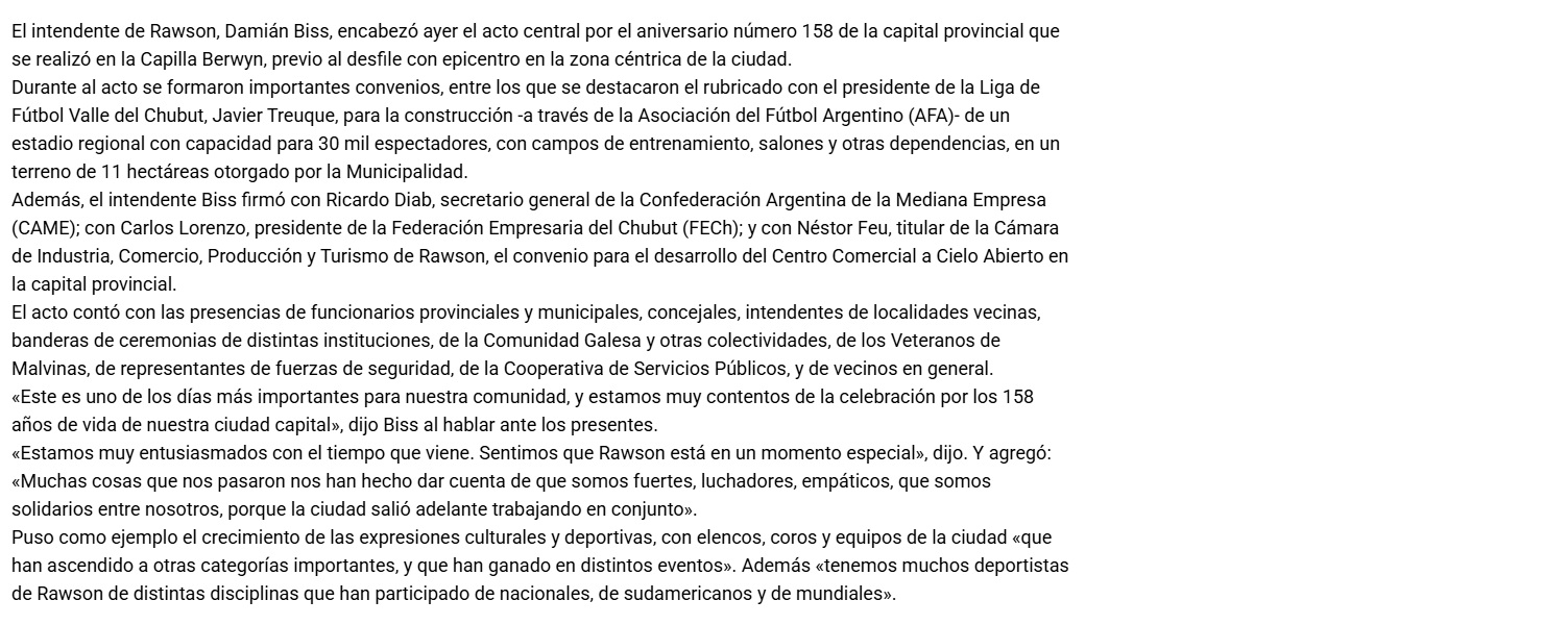 “Estamos muy entusiasmados con el tiempo que viene. Sentimos que Rawson está en un momento especial”, aseguró Biss, y resaltó: “Este es uno de los días más importantes para nuestra comunidad, y estamos muy contentos de la celebración por los 158 años de vida de nuestra ciudad capital”.