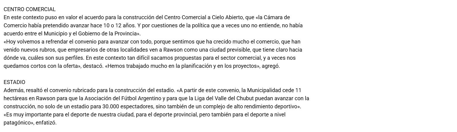 En cuanto la construcción para 30 mil personas, el intendente resaltó la firma del convenio, a partir del cual el Municipio cedería 11 hectáreas para que “la Asociación del Fútbol Argentino y la Liga del Valle del Chubut puedan avanzar con la construcción, no solo de un estadio para 30.000 espectadores, sino también de un complejo de alto rendimiento deportivo”.