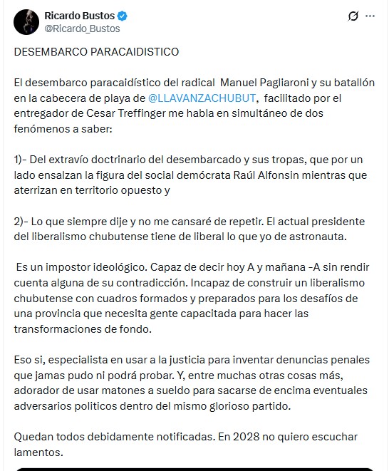 En su publicación, Bustos calificó la llegada del dirigente radical como un “desembarco paracaidístico” dentro del espacio libertario y cuestionó la coherencia ideológica del acuerdo político. “El desembarco paracaidístico del radical Manuel Pagliaroni y su batallón en la cabecera de playa de La Libertad Avanza Chubut (…) me habla de un extravío doctrinario”, expresó.