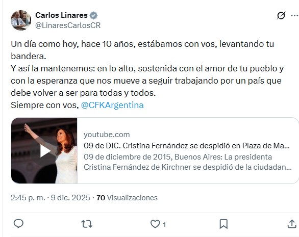A través de su cuenta de X, Linares publicó un mensaje cargado de simbolismo político y emocional: “Un día como hoy, hace 10 años, estábamos con vos, levantando tu bandera. Y así la mantenemos: en lo alto, sostenida con el amor de tu pueblo y con la esperanza que nos mueve a seguir trabajando por un país que debe volver a ser para todas y todos. Siempre con vos, Cristina Fernández de Kirchner”.