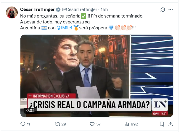 En el mismo posteo, Treffinger reforzó su posicionamiento al sostener: “A pesar de todo, hay esperanza porque Argentina con Javier Milei será próspera”.
