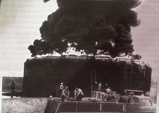 El tanque que acaba de explotar contiene ocho millones de litros de petróleo. A pocos metros están los otros, unos metros más… las casas de los vecinos. La amenaza aumenta a cada instante, los bomberos sólo pueden enfriar las paredes del tanque y mantener el terraplén para contener el petróleo que, de un momento a otro, correrá libre sin paredes que lo contengan.