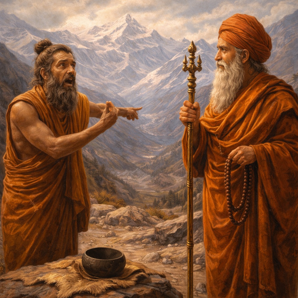 El sadhu pobre se sorprendió, pero, a fin de poder mantener su imagen, tuvo que acceder a hacer una peregrinación que en verdad le apetecía muy poco. Ambos sadhus se pusieron en marcha. Unos momentos después, súbitamente, el sadhu pobre se detuvo y, alarmado, exclamó: