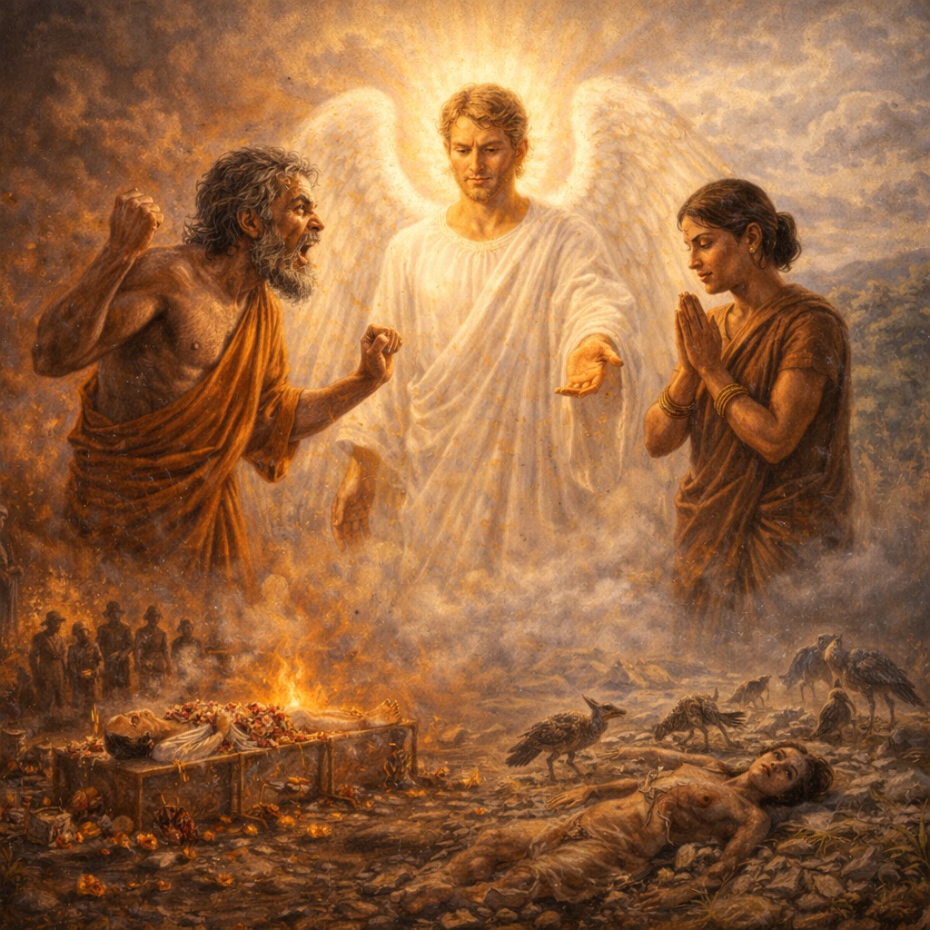 -Te quejas de ser conducido a las regiones inferiores a pesar de haber gastado tu vida en austeridades y penitencias, y de que, en cambio, la mujer haya sido conducida a las regiones de la luz. Pero, ¿es que no comprendes que somos aquello que cosechamos? Echa un vistazo a la tierra.Allí yace tu cuerpo, rociado de perfume y cubierto de pétalos de rosa, honrado por todos, cortejado por músicos y plañideras, a punto para ser incinerado con todos los honores. En cambio, mira el cuerpo de la prostituta, abandonado a los buitres y chacales, ignorado por todos y por todos despreciado. Pero, sin embargo, ella cultivó pureza y elevados ideales para su corazón pensando en Dios constantemente, y tú, por el contrario, de tanto mirar el pecado, teñiste tu alma de impurezas. ¿Comprendes, pues, por qué cada uno de ustedes va a una región tan diferente?