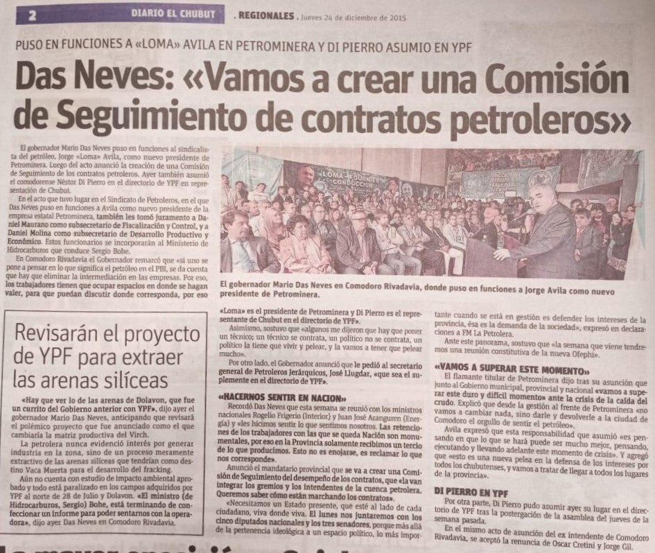 El 24 de diciembre de 2015, el entonces gobernador Mario Das Neves designó al sindicalista del petróleo, Jorge “Loma” Ávila como presidente de Petrominera y un rato después anunció la creación de una Comisión de Seguimiento de los contratos petroleros. Un día antes, había asumido en el directorio de YPF el exintendente de Comodoro Néstor Di Pierro.