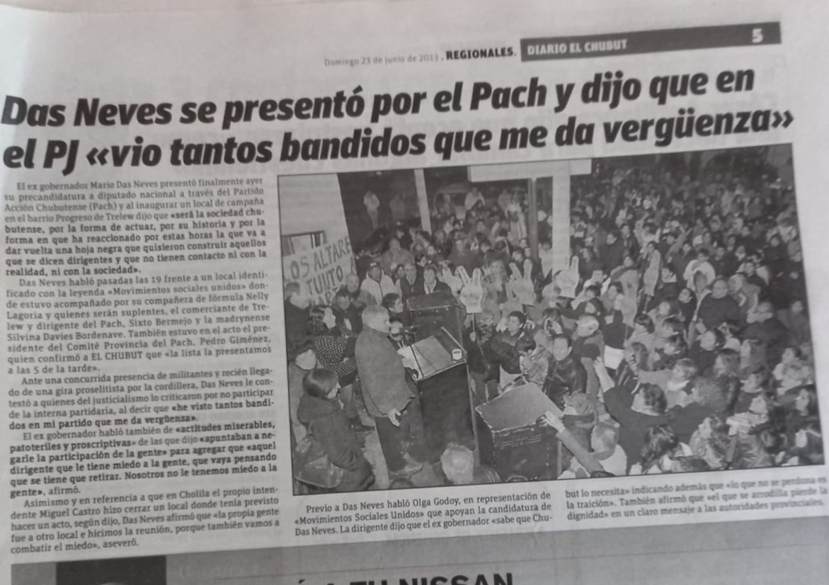 En junio de 2013, Mario Das Neves oficializó su precandidatura a diputado nacional por el Partido Acción Chubutense (PACH). Durante la inauguración de un local de campaña en el barrio Progreso de Trelew, respondió con dureza a quienes lo cuestionaban por no haberse sumado a la interna del Partido Justicialista.