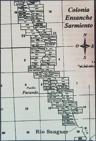 Mención aparte merece Colonia Ensanche Sarmiento, creada por decreto, el 21 de diciembre de 1901, con 62.500 hectáreas en torno al valle del curso medio del río Senguer (entre la confluencia del arroyo Genoa y el río Senguer -paraje Choiquenilahue-, por el norte; y la confluencia de los ríos Mayo y Senguer, por el sur). Abarcaba una extensión aproximada de 70 kilómetros de longitud, con 100 lotes de 625 hectáreas, tendidos a ambos lados de las márgenes del río. La numeración de los lotes iba del 200 al 300, de sur a norte. El 25 de febrero de 1902 el Ingeniero Pedro A. Vinent comenzó a realizar la mensura, tomando como punto de partida el vado Choiquenilahue, el límite norte de Colonia