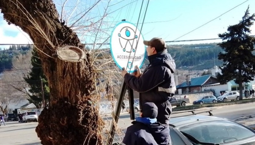 Cartelería alusiva a la accesibilidad en algunas arterias céntricas de la ciudad de Esquel.