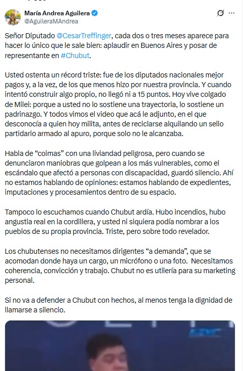 La legisladora no se limitó a responder las críticas al gobernador, sino que apuntó directamente contra la trayectoria política de Treffinger. Lo acusó de haber sido “uno de los diputados nacionales mejor pagos y de los que menos hizo por Chubut”, de no haber logrado construir un proyecto propio en la provincia y de sostener hoy su vigencia política únicamente por su alineamiento con el presidente Javier Milei.