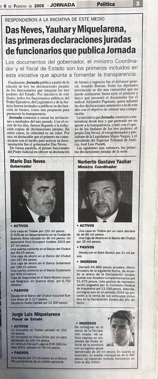 A comienzos de 2005, bajo el slogan “SER TRANSPARENTE SER CHUBUT”, el gobernador Mario Das Neves, el ministro Coordinador Norberto Yauhar y el fiscal de Estado Jorge Miquelarena publicaron sus patrimonios e ingresos, iniciativa que pretendió “ser un aporte a la transparencia” de la gestión.