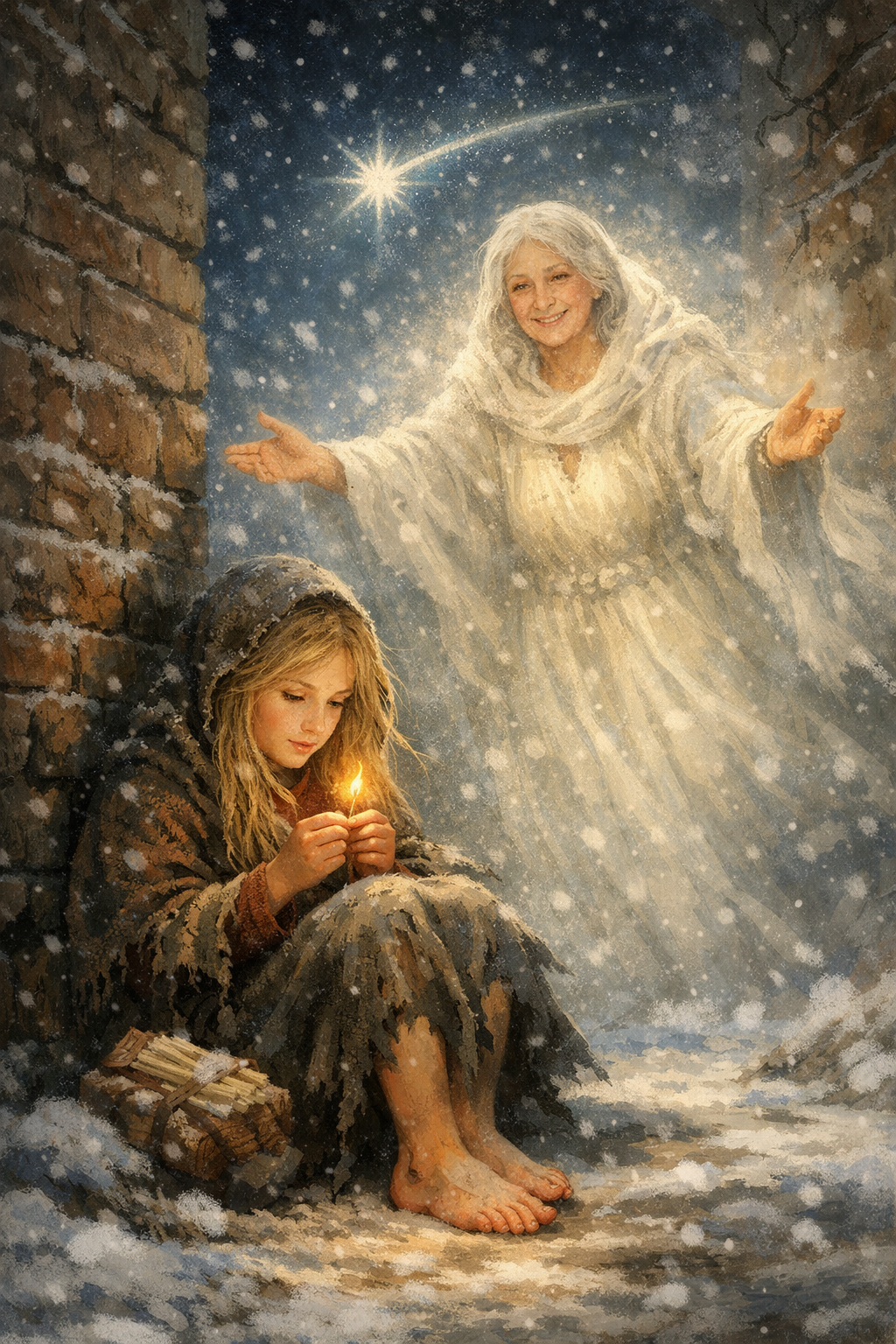 Pero en el ángulo de la casa, la fría madrugada descubrió a la chiquilla, rojas las mejillas y la boca sonriente… Muerta, muerta de frío en la última noche del Año Viejo. La primera mañana del Nuevo Año iluminó el pequeño cadáver sentado con sus fósforos: un paquetitoque parecía consumido casi del todo. «¡Quiso calentarse!», dijo la gente. Pero nadie supo las maravillas que había visto, ni el esplendor con que, en compañía de su anciana abuelita, había subido a la gloria del Año Nuevo.