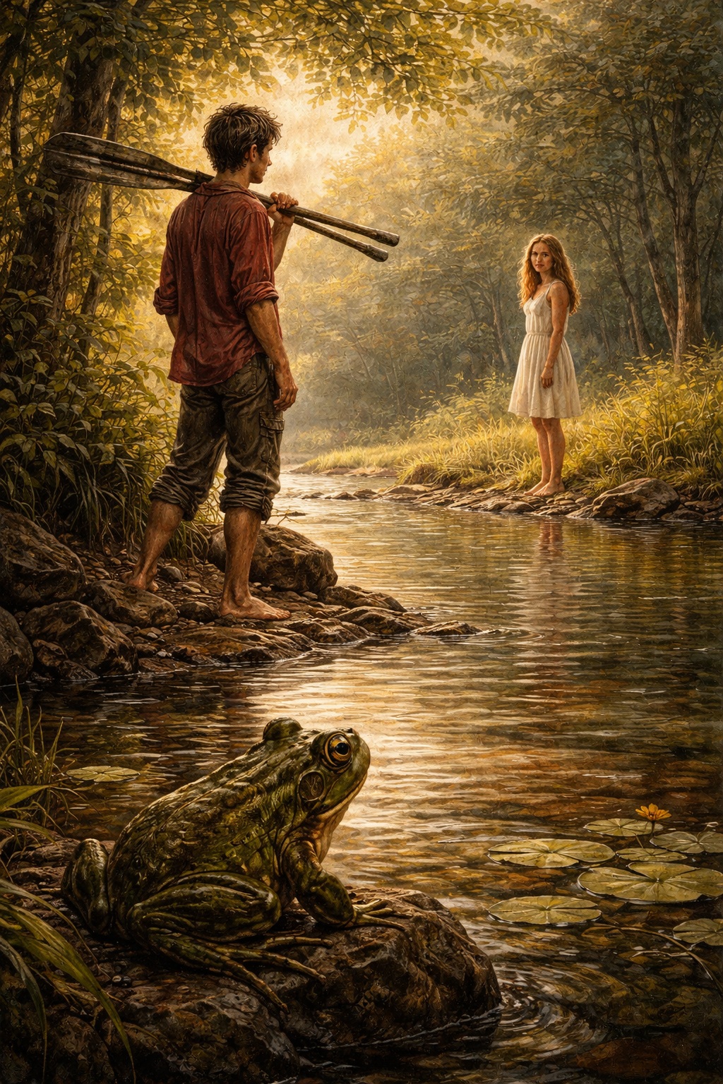 El muchacho miró una vez más el río. El silencio se asentaba sobre la líquida piel de aquel interminable cuerpo. Círculos que se alargaban y perdían en la superficie tranquila, mostraban el lugar donde por fin la rana se había sumergido. Entonces el muchacho se metió en el agua y nadó hacia la otra orilla, mientras el bulto blanco y desnudo de la muchacha se recogía hacia la penumbra de las ramas.