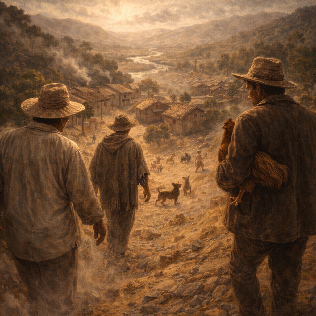 Ese alguien es Melitón. Junto con él, vamos Faustino, Esteban y yo. Somos cuatro. Yo los cuento: dos adelante, otros dos atrás. Miro más atrás y no veo a nadie. Entonces me digo: “Somos cuatro.” Hace rato, como a eso de las once, éramos veintitantos, pero puñito a puñito se han ido desperdigando hasta quedar nada más que este nudo que somos nosotros. Faustino dice: