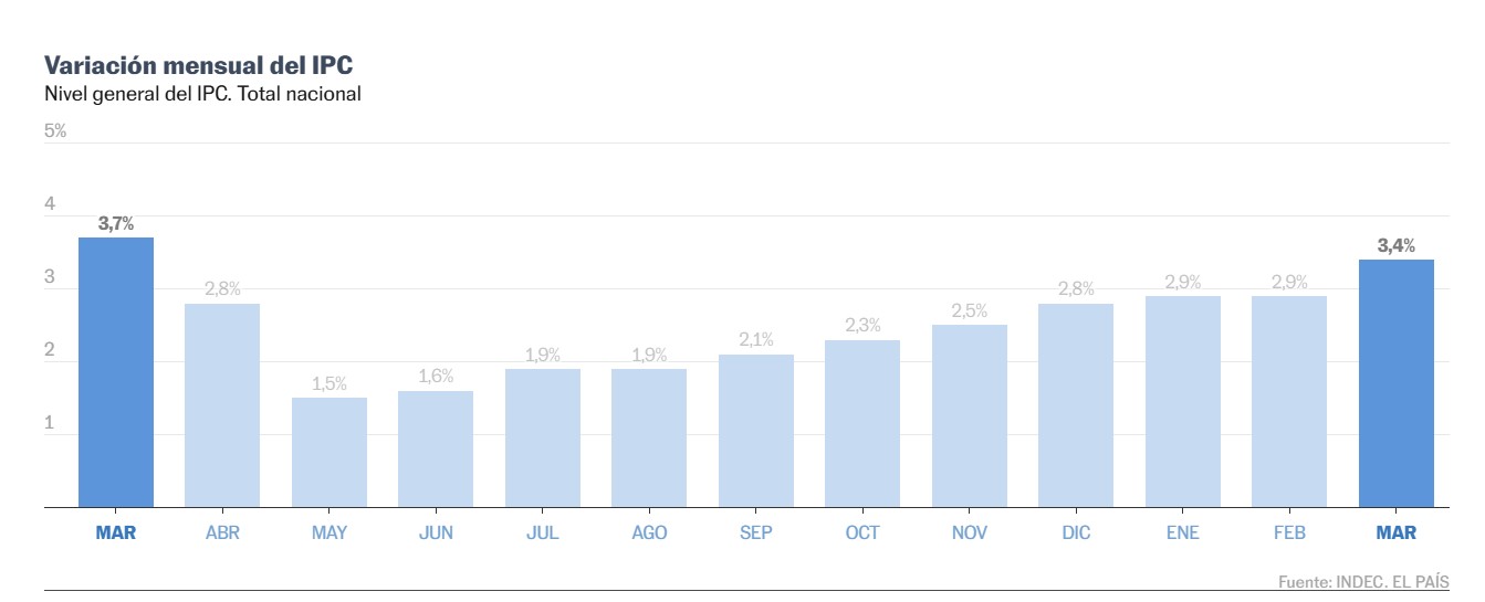 La inflación en marzo fue de 3,4% en Argentina, lo que representa el décimo mes consecutivo en el que la suba de precios se acelera en el país. El ministro de Economía, Luis Caputo, habló antes de la difusión del dato oficial como una manera de amortiguar el golpe y mejorar los ánimos de una población que empieza a hacer escuchar su malestar. Atribuyó gran parte del aumento al impacto de la guerra en Medio Oriente, que disparó el precio de los combustibles, y anticipó que a partir de abril vendrán “los 20 mejores meses que Argentina haya visto en las últimas décadas”.