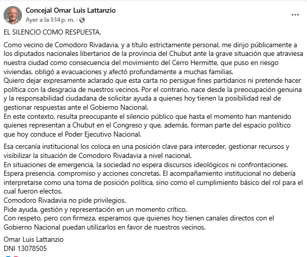 A través de un extenso mensaje difundido en sus redes sociales, Lattanzio se expresó “como vecino de Comodoro Rivadavia y a título estrictamente personal”, y remarcó que su planteo no tiene fines partidarios ni busca “hacer política con la desgracia de los vecinos”, sino que surge de la preocupación y la responsabilidad ciudadana ante una emergencia que puso en riesgo viviendas, obligó a evacuaciones y afectó a numerosas familias.