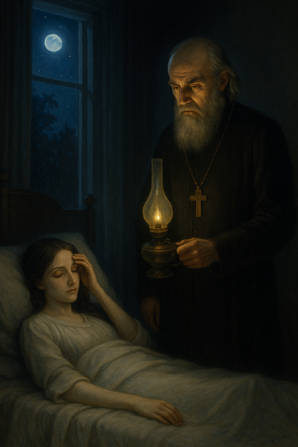 Aquella misma noche, una noche clara y serena de julio, el pope Ignacio subió, de puntillas, al cuarto de Vera. No habían abierto la ventana desde su muerte, y el ambiente era allí cálido y seco. La luna iluminaba el suelo, los rincones y la cama blanca, con sus dos almohadas, una grande y otra pequeña.
