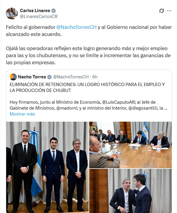 En su cuenta de X, Linares afirmó: “Felicito al gobernador Ignacio Torres y al Gobierno nacional por haber alcanzado este acuerdo. Ojalá las operadoras reflejen este logro generando más y mejor empleo para las y los chubutenses, y no se limite a incrementar las ganancias de las propias empresas.”