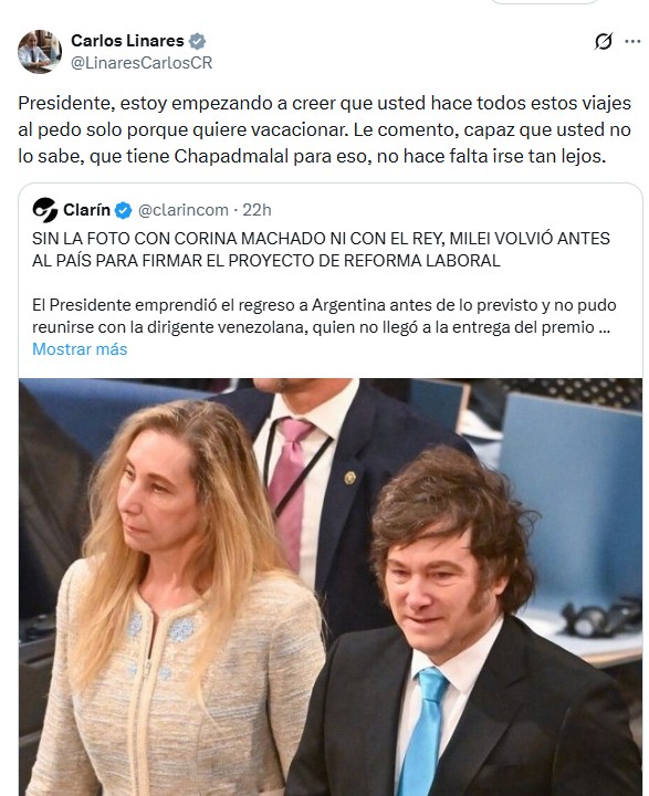 El planteo del legislador se produjo a partir de una publicación de un diario de Capital Federal titulada “Sin la foto con Corina Machado ni con el Rey, Milei volvió antes al país para firmar el proyecto de reforma laboral”, que fue citada por Linares en sus redes sociales.