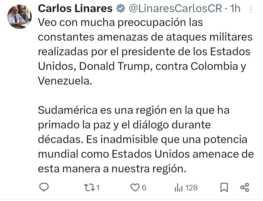 “Veo con mucha preocupación las constantes amenazas de ataques militares realizadas por el presidente de los Estados Unidos, Donald Trump, contra Colombia y Venezuela”, afirmó Linares, al remarcar que cualquier escalada verbal proveniente de una potencia militar tiene efectos directos en la región.