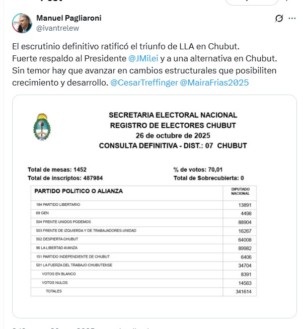 Por su parte, Pagliaroni, exdiputado provincial y referente de la UCR, escribió en su cuenta de la red social X: “El escrutinio definitivo ratificó el triunfo de LLA en Chubut. Fuerte respaldo al Presidente Javier Milei y a una alternativa en Chubut. Sin temor hay que avanzar en cambios estructurales que posibiliten crecimiento y desarrollo”.