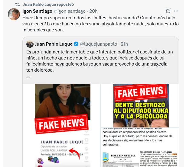 A través de un extenso descargo, Luque rechazó de plano esas versiones y denunció una maniobra de carácter político. “Es profundamente lamentable que intenten politizar el asesinato de un niño”, sostuvo, al tiempo que calificó las acusaciones como “fake news” y una “operación de una bajeza sin precedentes”.