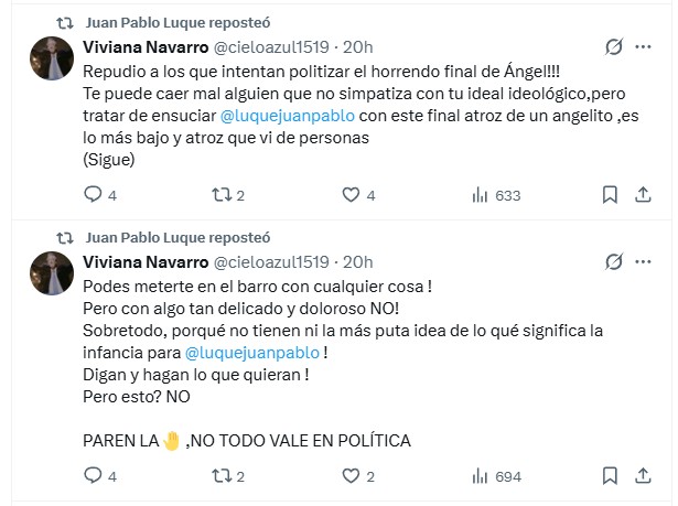 Por su parte, la exdiputada provincial Viviana Navarro expresó un fuerte repudio a lo que consideró una utilización política del caso: “Tratar de ensuciar a Juan Pablo Luque con este final atroz es lo más bajo que vi”, sostuvo, y pidió “poner un límite” a este tipo de prácticas.