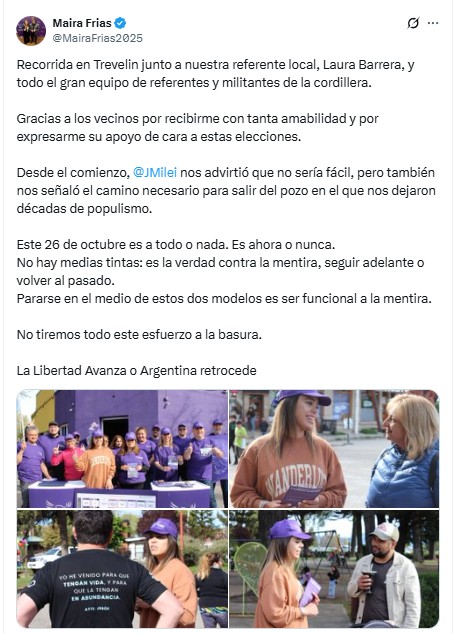 En sus publicaciones en la red social X, Frías destacó el acompañamiento recibido y envió un mensaje político centrado en el rumbo del gobierno nacional.