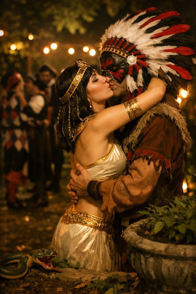 Nos pusimos caretas o antifaces. Yo llevaba un antifaz dorado para no desentonar con la pechera áurea de Cleopatra. Cuando ingresamos en el baile (era un club de Malvín) hubo murmullos de asombro, y hasta aplausos. Parecíamos un desfile de modelos. Como siempre, nos separamos y yo me divertí de lo lindo. Bailé con un arlequín, un domador, un paje, un payaso y un marqués. De pronto, cuando estaba en plena rumba con un chimpancé, un cacique piel roja, de buena estampa, me arrancó de los peludos brazos del primate y ya no me dejó en toda la noche. Bailamos tangos, más rumbas, boleros, milongas, y fuimos sacudidos por el recién estrenado seísmo del rock-and-roll. Mi pareja llevaba una careta muy pintarrajeada, como correspondía a su apelativo de Cara Rayada.