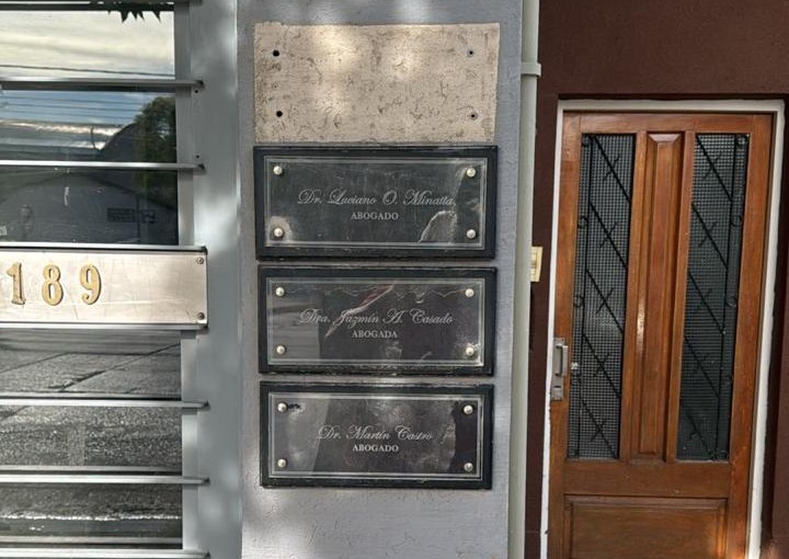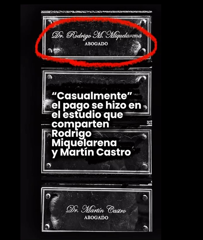 El estudio jurídico que compartes los abogados Martín Castro y Rodrigo Miquelarena, ubicado en Hipólito Yrigoyen 1189, amaneció sin la placa que identificaba a Rodrigo Miquelarena como integrante del bufete.