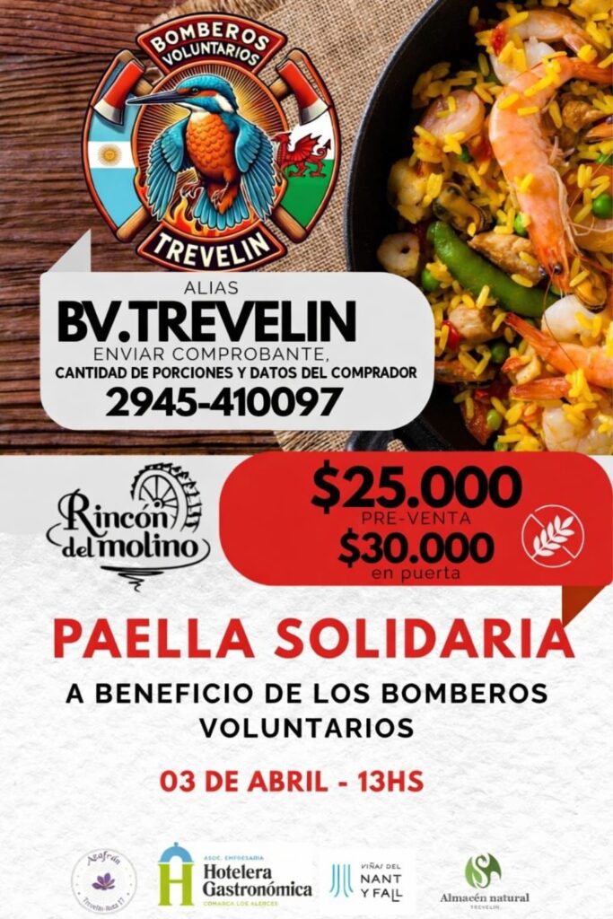 La paella se realizará el 3 de abril en El Rincón del Molino, y la entrada es gratuita. El valor de la porción será de $25.000 en preventa y $30.000 el día del evento. También se puede colaborar mediante transferencia al alias BV.Trevelin o en efectivo en el lugar.