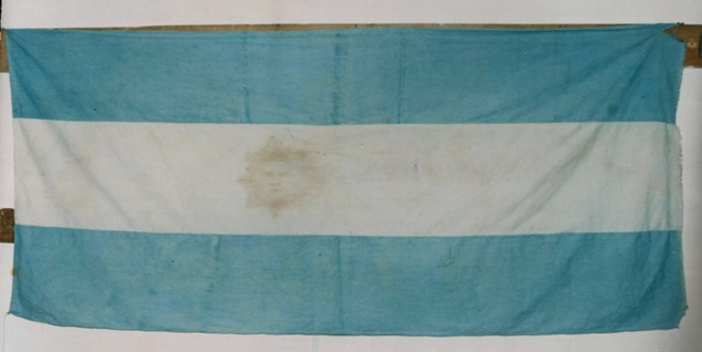 Fue confeccionada con telas de sábanas, cocidas a mano y teñidos los paños de celeste por las primeras mujeres inmigrantes a quien el Ing. Policarpo Coronel les encargó esta tarea. El Sol fue resuelto magníficamente por las mujeres aborígenes, con tintas de calafate y molle, dejando aquí su impronta de excelentes pintores de kai ajnún [mantas pintadas] o quillangos usados por los pueblos tehuelches.