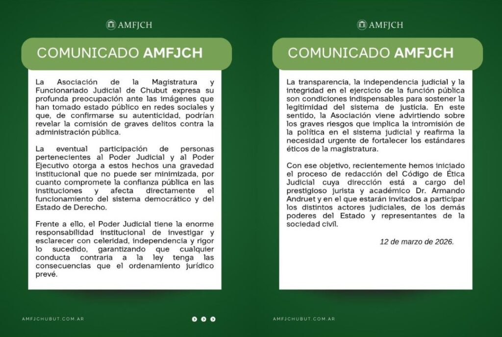 La Asociación de la Magistratura y Funcionariado Judicial de Chubut (AMFJCH) expresó su “profunda preocupación” por las imágenes que comenzaron a circular en redes sociales y que, de confirmarse su autenticidad, podrían revelar la comisión de graves delitos contra la administración pública.