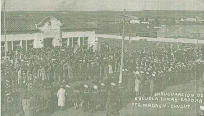 Toda mi carrera como docente (30 años) la ejercí en la Escuela “Tomás Espora”, ubicada en la calle Domecq García. La escuelita de la loma” como la llamábamos o como dice la marcha de la escuela, compuesta por el maestro Daniel Bustamante (letra) y el profesor Vicente Autiero (música) “…escuelita Tomás Espora como un faro frente al mar…” Es la segunda escuela fundada en Pto. Madryn. Abre sus puertas el 10 de junio de 1935. Funcionaba en un local alquilado en la calle Agustín Pujol s/n. Su estructura edilicia estaba compuesta por un solo salón dividido por un tabique de madera.