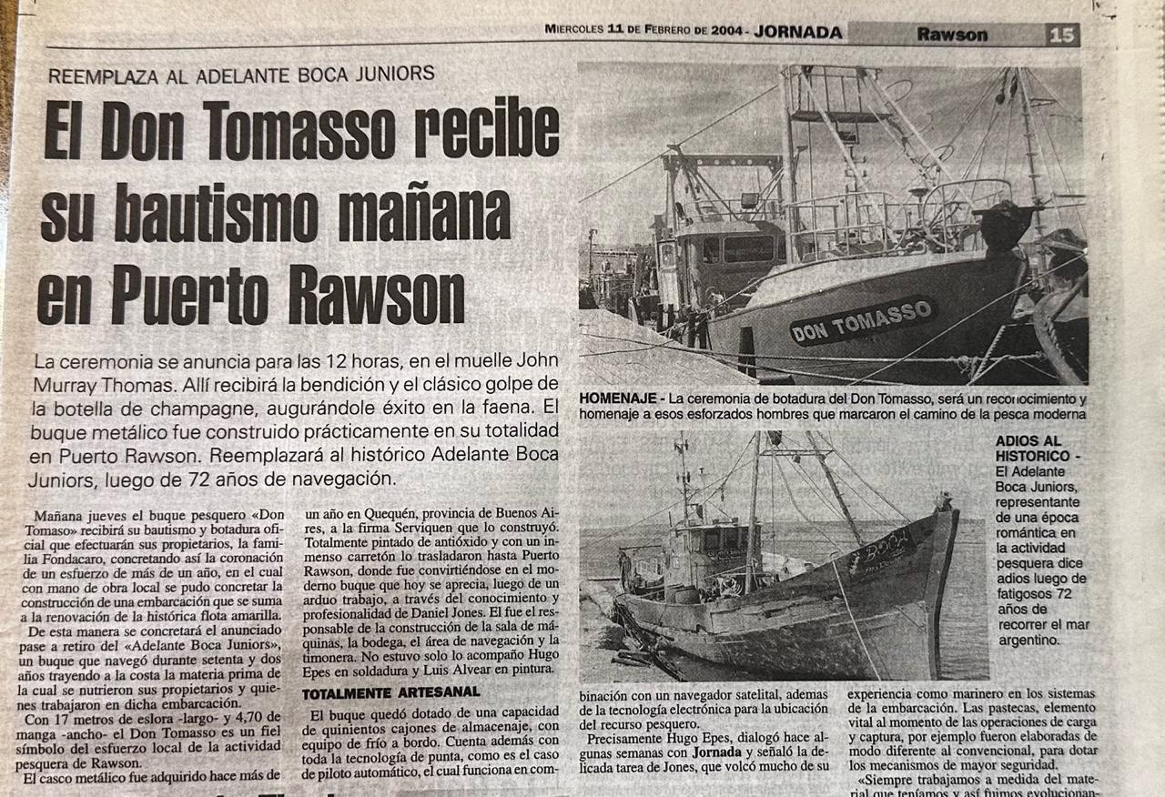 El 12 de febrero de 2004 el barco Don Tomasso recibió su bautismo y reemplazó formalmente a “Adelante Boca Juniors”, histórica embarcación de Puerto de Rawson, que durante 72 años navegó las aguas del mar argentino.