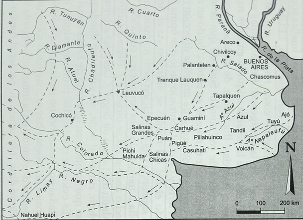 Los caminos transitados en la pampa, por los españoles primero y por los argentinos luego, han seguido la ruta de los usados por los indios, por las rastrilladas. Mansilla define el Término diciendo que “una rastrillada son los surcos paralelos y tortuosos que con sus constantes idas y venidas han dejado los indios en el campo. Estos surcos, parecidos a la huella que hace una carreta la primera vez que cruza por un terreno virgen, suelen ser profundos, y constituyen un verdadero camino ancho y sólido. En plena pampa no hay más camino. Apartarse de ellos un palmo, salirse de la senda, es muchas veces un peligro real, porque no es difícil que ahí mismo, al lado de la rastrillada, haya un guadal en el que se entierran caballo y jinețe enteros”. Mansilla, que nos describe en 1870 los únicos caminos que en aquel entonces atravesaban la pampa, agrega: “de Leuvucó arrancan caminos, grandes rastrilladas por todas partes. Allí es la estación central. Salen caminos para las tolderías de Ramón, que quedan en los montes de Carrilovo, para las tolderías de Baigorrita, situadas a las orillas de los montes de Quenque; para las tolderías de Calfucurá, en Salinas Grandes para la cordillera y para las tribus araucanas”