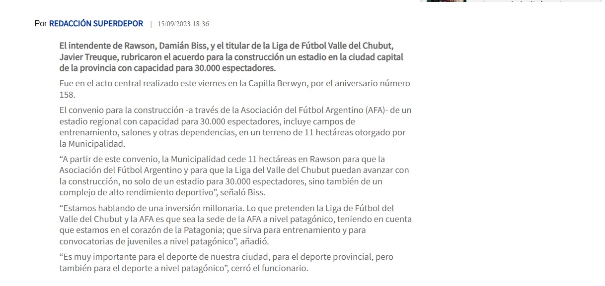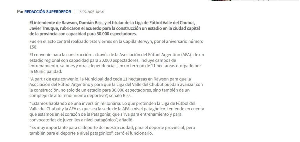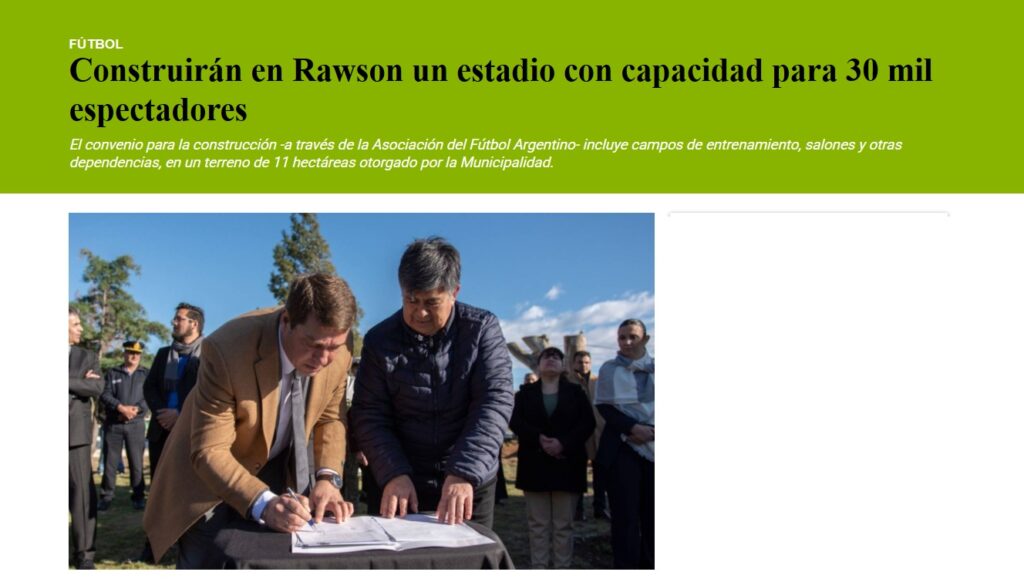 “A partir de este convenio, la Municipalidad cede 11 hectáreas en Rawson para que la Asociación del Fútbol Argentino y para que la Liga del Valle del Chubut puedan avanzar con la construcción, no solo de un estadio para 30.000 espectadores, sino también de un complejo de alto rendimiento deportivo”, explicó Biss.