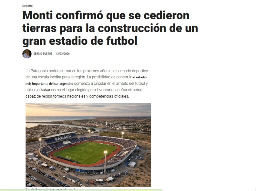 La semana pasada, el presidente del Concejo Deliberante de Rawson confirmó que el Municipio cedió 10 hectáreas para avanzar con el proyecto del complejo deportivo que actualmente se encuentra en fase de “en fase de análisis y elaboración”.