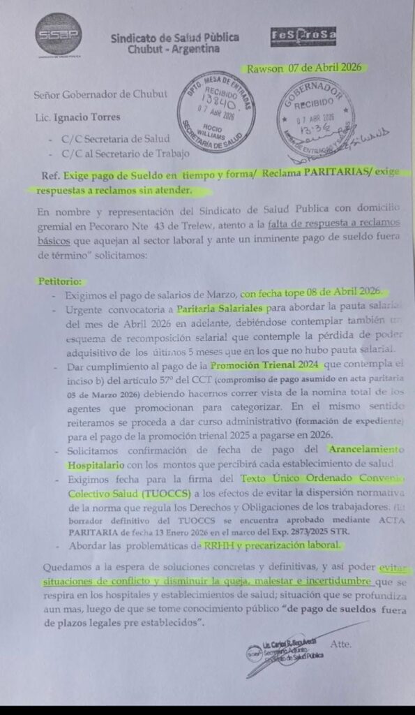 El documento, fechado en Rawson el 7 de abril de 2026 y con ingreso formal por mesa de entradas del Gobierno y la Secretaría de Salud, advierte sobre la “falta de respuesta a reclamos básicos” y la inminencia de un pago de haberes fuera de término, situación que podría agravar el conflicto en hospitales y centros de salud.