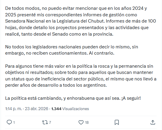 En su descargo, la senadora defendió su gestión y afirmó que durante 2024 y 2025 presentó informes de más de 100 páginas ante la Legislatura de Chubut, donde detalló su actividad parlamentaria y territorial. “No todos los legisladores nacionales pueden decir lo mismo, sin embargo no reciben cuestionamientos”, advirtió.