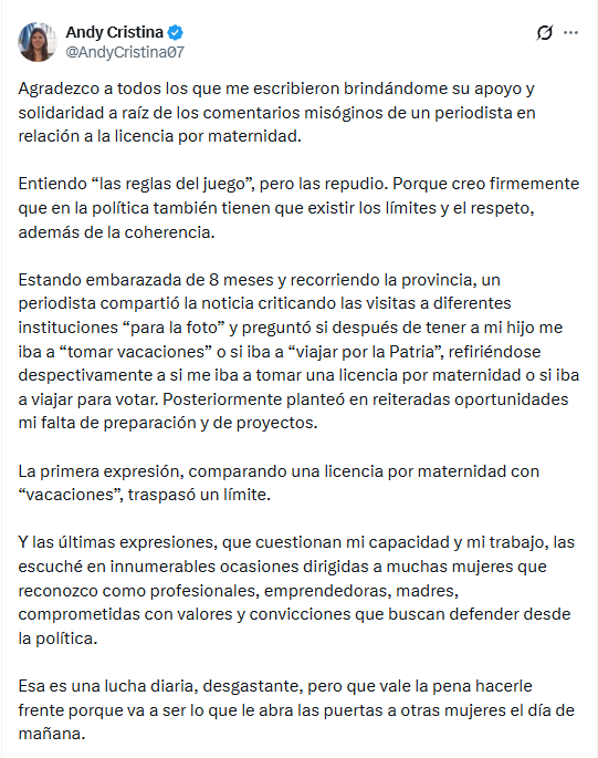 Cristina consideró que esa comparación “traspasó un límite”, al equiparar una licencia prevista por ley con un período de descanso personal. Además, señaló que el periodista puso en duda su preparación y la falta de proyectos, críticas que “suelen recaer con mayor frecuencia sobre mujeres en política”, remarcó.
